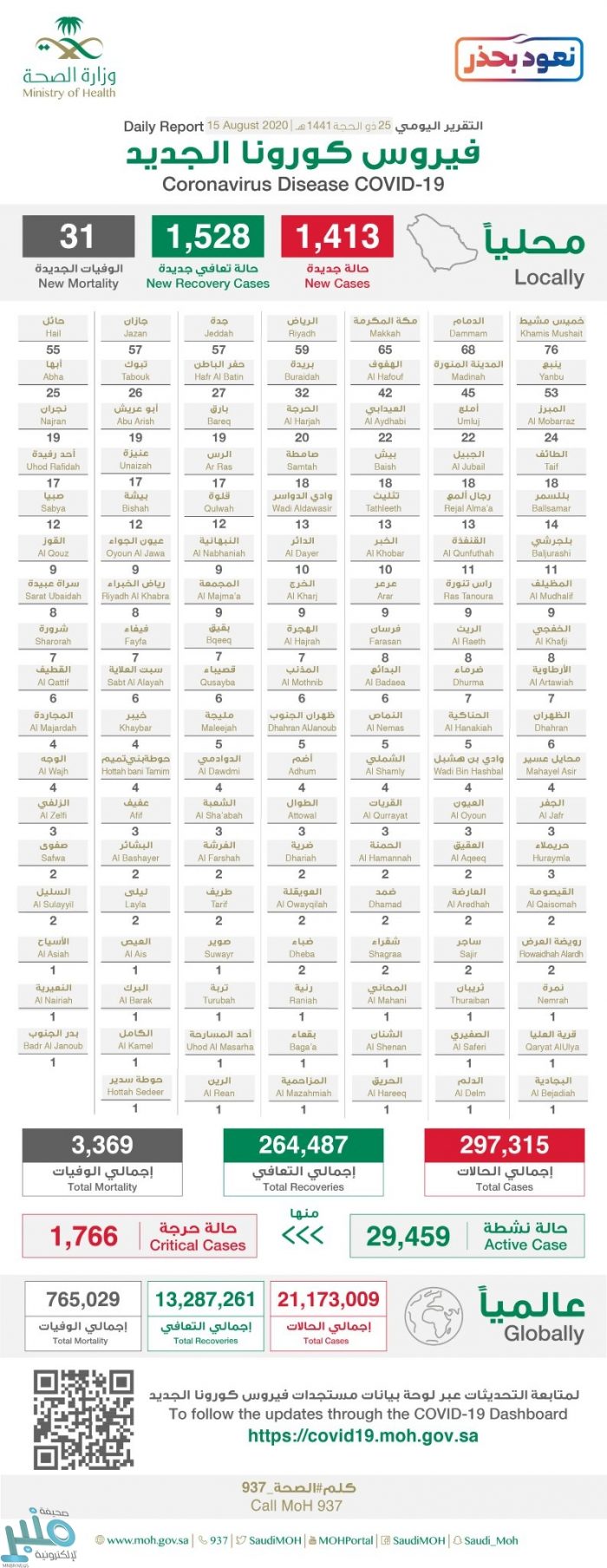 وأضافت الصحة أن إجمالي حالات المصابين في المملكة وصل إلى 297315 حالة حتى الآن .