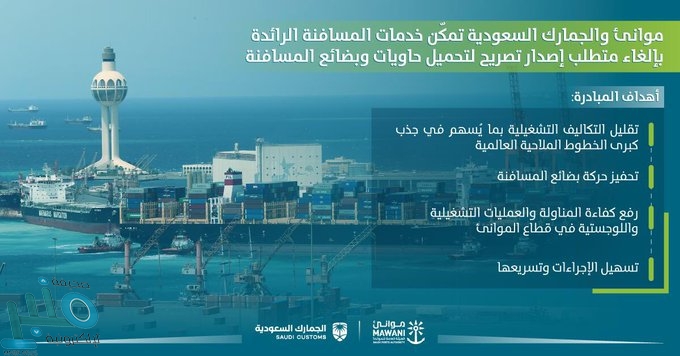 أعلنت الهيئة العامة للموانئ “موانئ” اليوم، بالتعاون مع الهيئة العامة للجمارك، عن إلغاء متطلب إصدار تصريح لتحميل حاويات وبضائع المسافنة، ضمن سلسلة من المبادرات الساعية إلى تسهيل وإعادة هندسة الإجراءات الخاصة بالمسافنة في قطاع الموانئ السعودية.