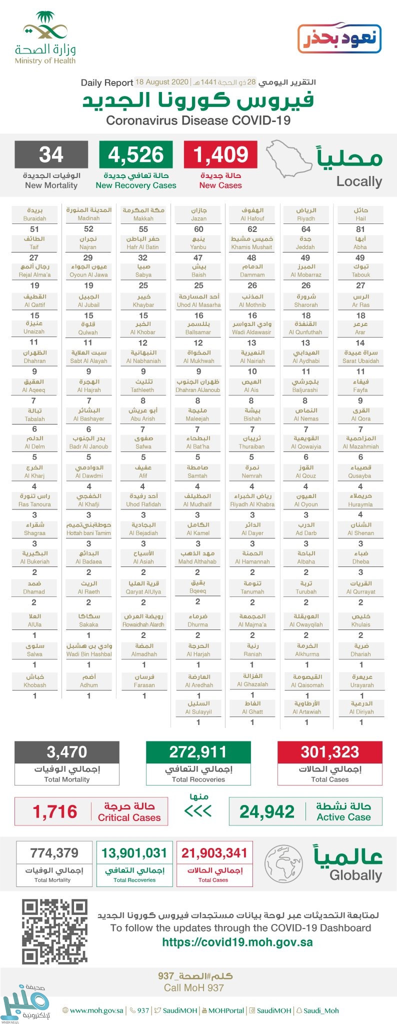 وأوضحت أنه تم تسجيل 34 وفيات جديدة في المملكة، ليصل إجمالي الوفيات إلى 3470 حالة.