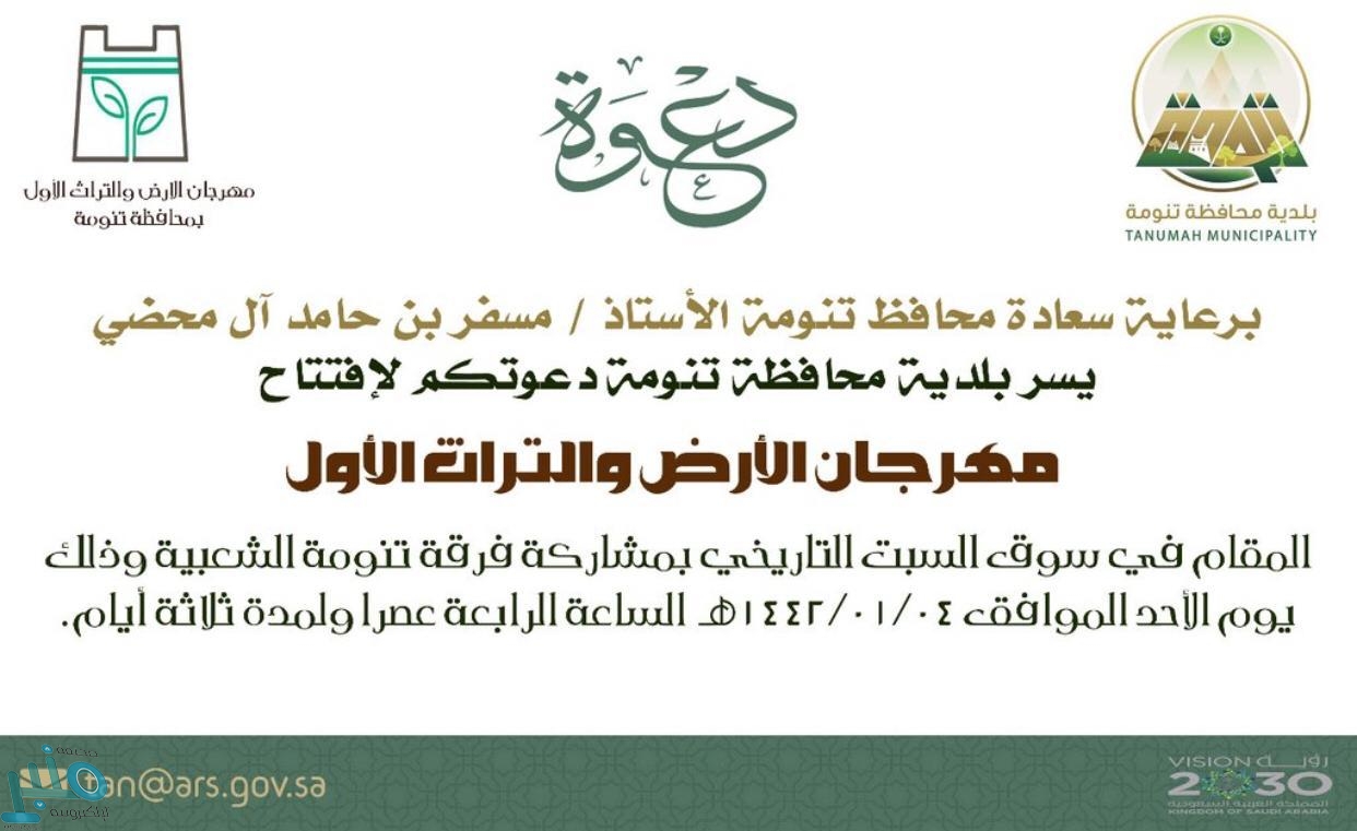 تلقت صحيفة منبر الإلكترونية دعوة لحضور مهرجان الأرض والتراث الأول في محافظة تنومة والذي يقام يوم الأحد المقبل، في سوق السبت التاريخي، تحت رعاية محافظ تنومة مسفر بن حامد آل مخضي.