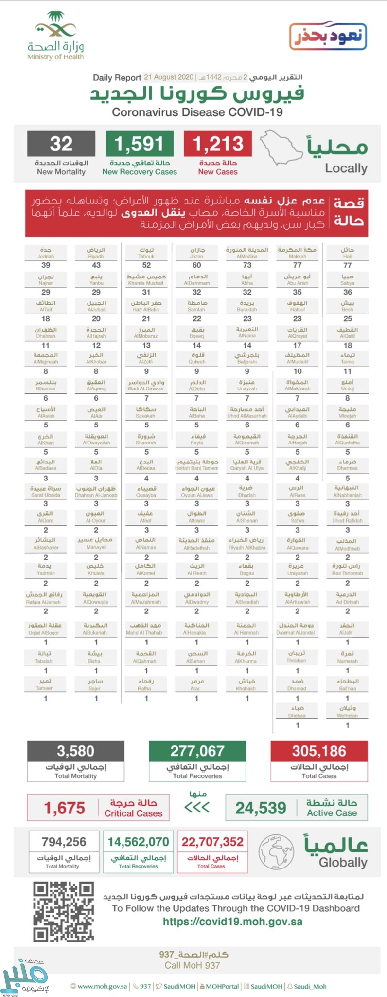 وأضافت الصحة أن إجمالي حالات المصابين في المملكة وصل إلى 305186 حالة حتى الآن .