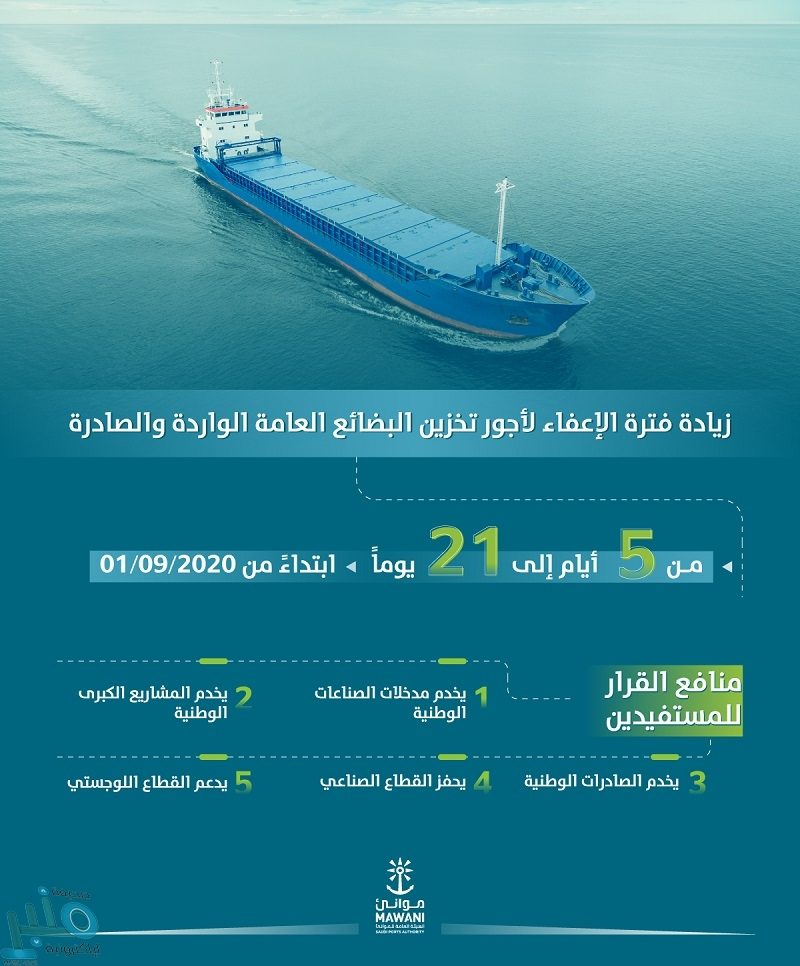 أعلنت الهيئة العامة للموانئ “موانئ” اليوم، زيادة فترة الإعفاء لأجور تخزين البضائع العامة (الواردة والصادرة) لتكون 21 يوماً بدلاً من 5 أيام، وذلك ابتداءً من تاريخ 1 / 9 / 2020.