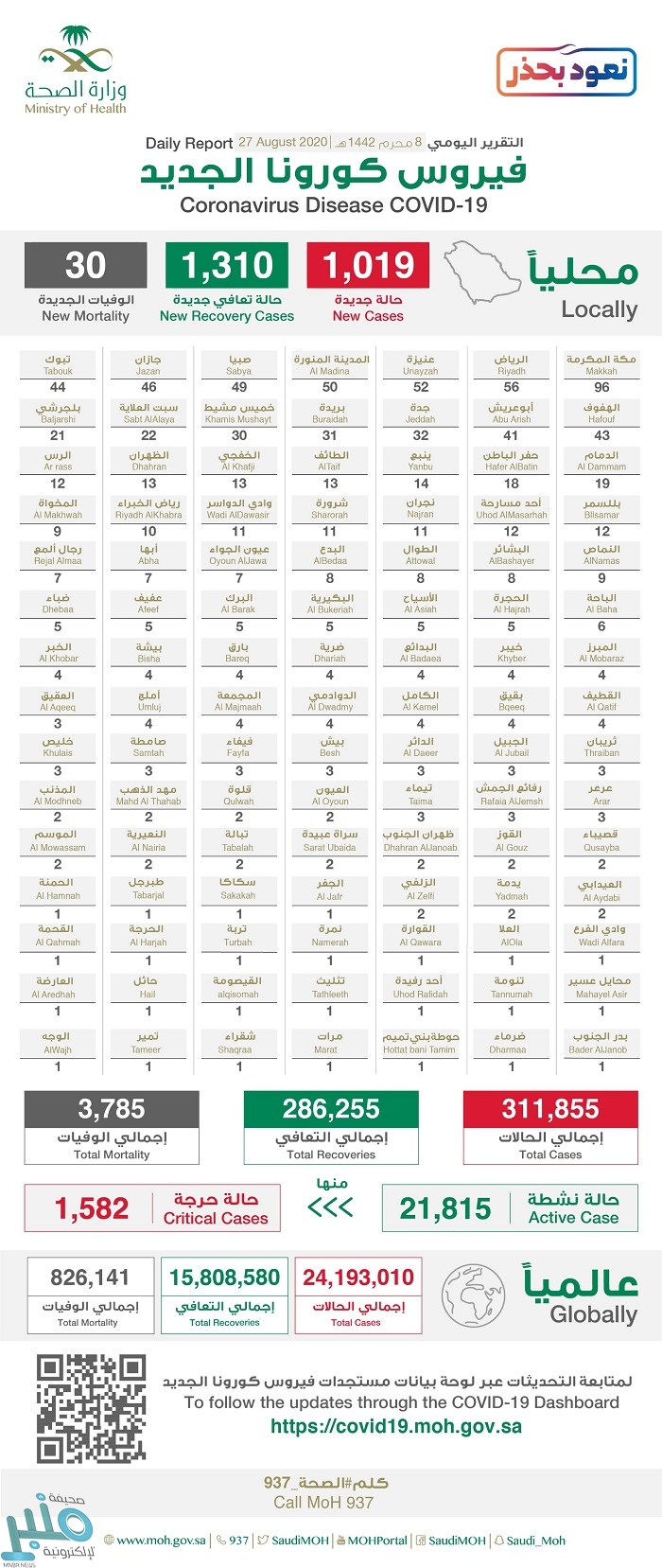 وأضافت الصحة أن إجمالي حالات المصابين في المملكة وصل إلى 311855 حالة حتى الآن .