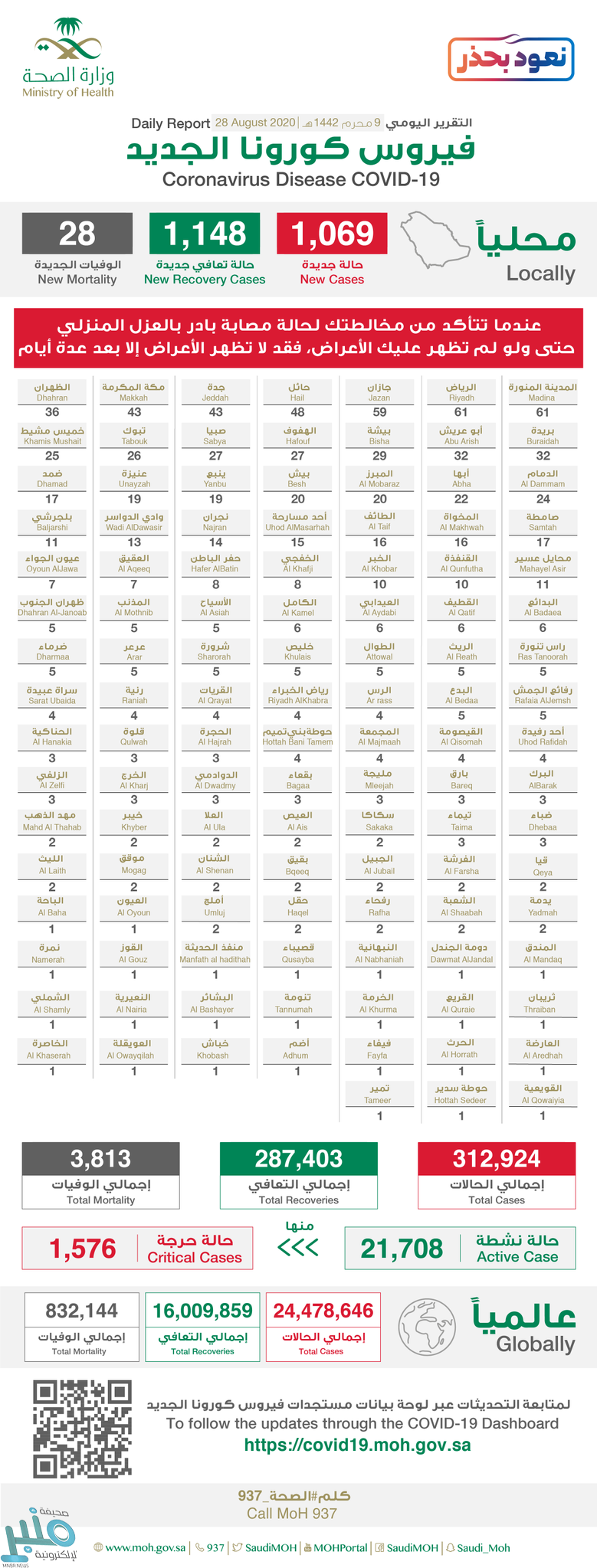 أعلنت وزارة الصحة، اليوم الجمعة ، عن تسجيل 1069 إصابة جديدة بفيروس “كورونا” ، و تسجيل 28 حالة وفاة جديدة ، ليصل إجمالي الوفيات إلى 3813 حالة .
