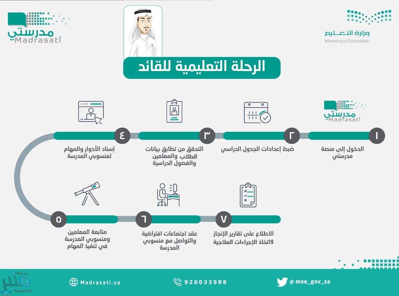 حدّدت وزارة التعليم دور قائد وقائدة المدرسة في نجاح الرحلة والعملية التعليمية عن بُعد في منصة مدرستي.