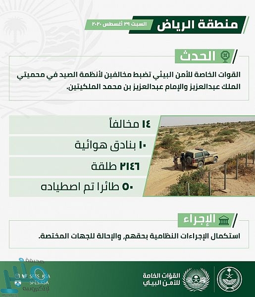 ضبطت القوات الخاصة للأمن البيئي أثناء أدائها لمهامها في محميتي الإمام عبد العزيز بن محمد، والملك عبد العزيز الملكيتين بالرياض (14) شخصاً من مخالفي أنظمة الصيد، وبحوزتهم (10) بنادق هوائية، و (2146) طلقة، وعدد من الأدوات التي تستخدم في الصيد ، إضافة إلى 50 طائراً اصطادوها.