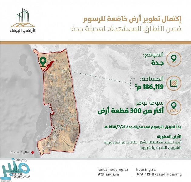 أعلن برنامج “الأراضي البيضاء” التابع لوزارة الإسكان عن اكتمال تطوير أرض خاضعة للرسوم من قِبل مالكها في محافظة جدة بمساحة تتجاوز 186 ألف متر مربع.