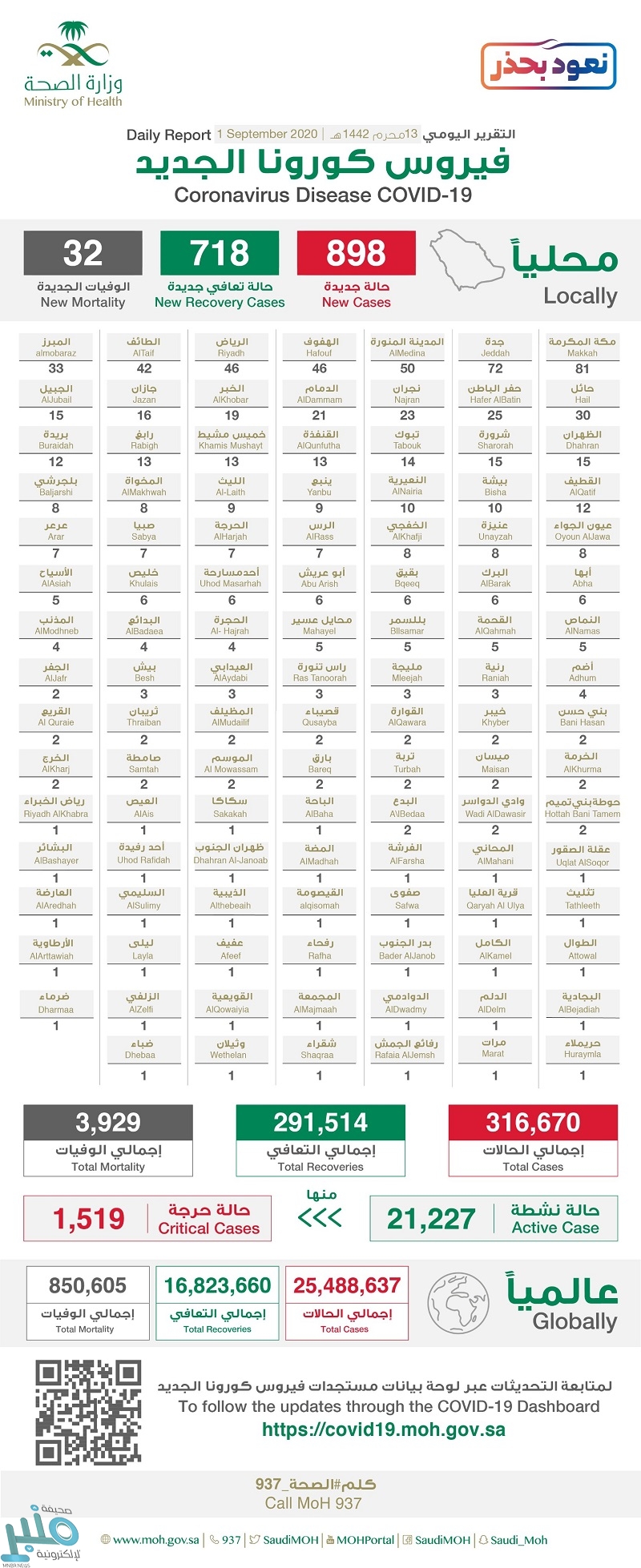 وأضافت الصحة أن إجمالي حالات المصابين في المملكة وصل إلى 316670 حالة حتى الآن .