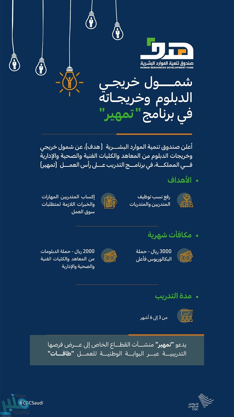 ويأتي إدراج حاملي مؤهل الدبلوم في برنامج “تمهير” نتيجة للنجاحات التي حققها البرنامج في الفترة الماضية حول إكساب المتدربين المهارات والخبرات اللازمة التي يطلبها سوق العمل، والإسهام في زيادة نسب توظيف المتدربين والمتدربات.