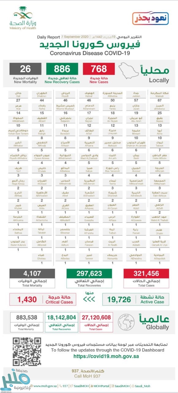 أعلنت وزارة الصحة، اليوم الإثنين ، عن تسجيل 768 إصابة جديدة بفيروس “كورونا” ، و تسجيل 26 حالة وفاة جديدة ، ليصل إجمالي الوفيات إلى 4107 حالة .
