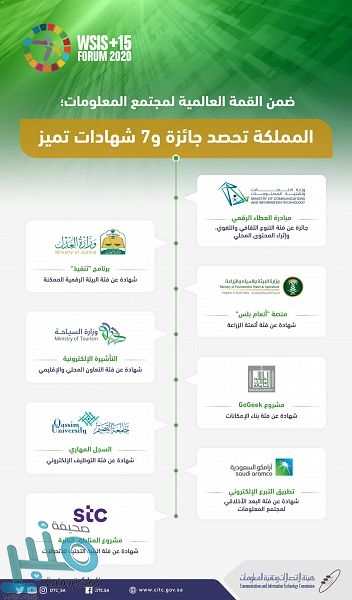 وحصلت المملكة ممثلةً بعددٍ من الجهات الحكومية والخاصة على جائزة و7 شهادات تميز ضمن المسابقة التي تعقدها القمة العالمية لمجتمع المعلومات، وذلك لتكريم أفضل المشاريع التي تسخر تقنيات الاتصالات وتقنية المعلومات في تنفيذ مخرجات القمة العالمية لمجتمع المعلومات. وبذلك يرتفع رصيد المملكة إلى (10) جوائز و(22) شهادة تميز حصلت عليها في دورات القمة السابقة منذ انطلاقها في العام 2012م.