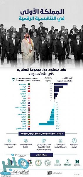 تربعت المملكة العربية السعودية على قائمة دول مجموعة العشرين في التنافسية الرقمية خلال السنوات الثلاث الماضية لتحتل المرتبة الأولى، وذلك ضمن تقرير التنافسية العالمي من المركز الأوروبي للتنافسية الرقمية، الذي يستند على تقرير التنافسية لمنتدى الاقتصاد العالمي.