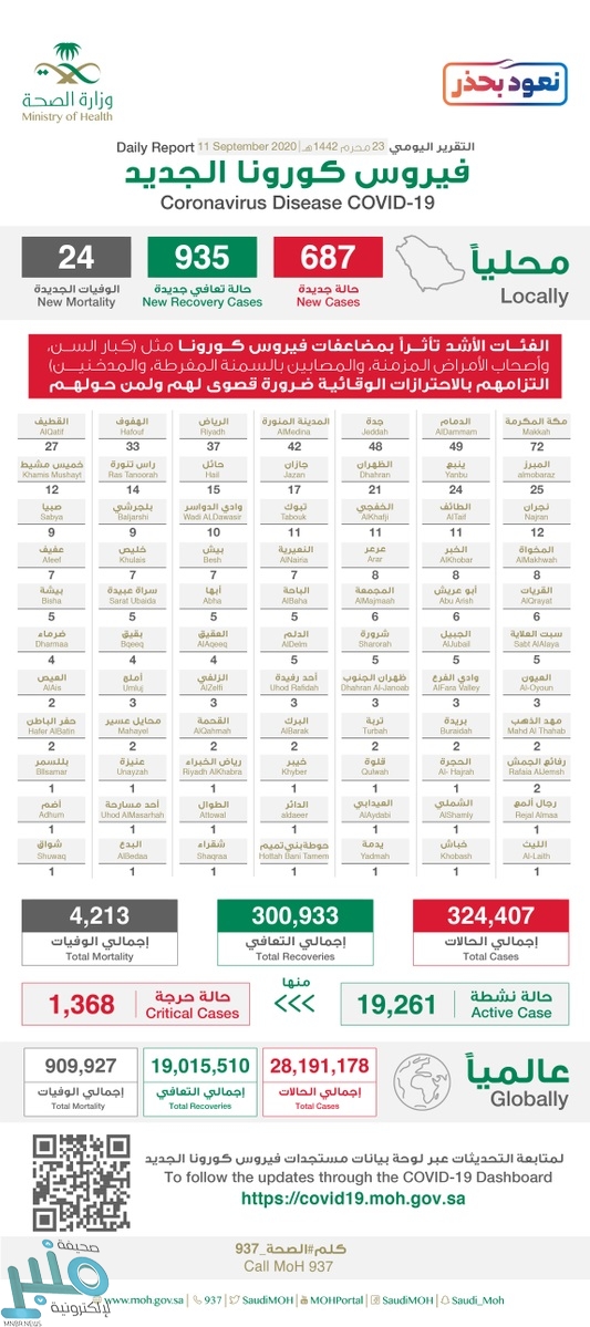 كما تم تسجيل 935 حالة تعافي جديدة ، ليصل مجموع المتعافين إلى 300933 حالة.