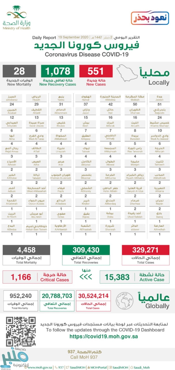 كما تم تسجيل 1078 حالة تعافي جديدة ، ليصل مجموع المتعافين إلى 309430 حالة.