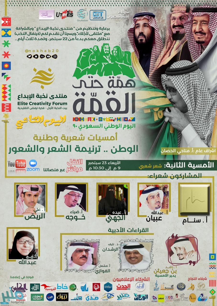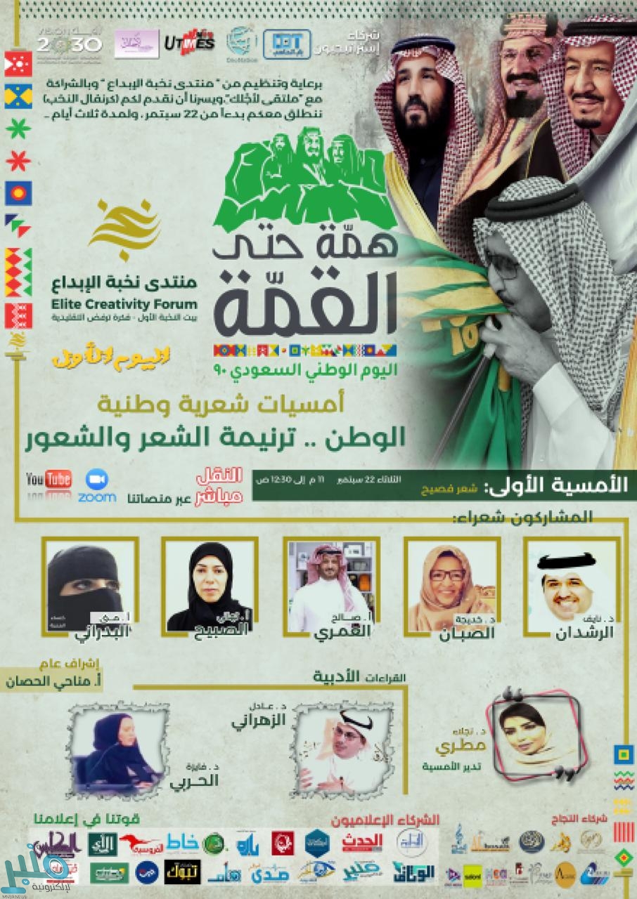 يقيم منتدى نخبة الإبداع بالشراكة مع “ملتقى لأجلك” إحدى أمسياته الشعرية الوطنية الخاصة “شعر فصيح” لليوم الوطني ٩٠ ضمن كرنفال النخب، الذي يقام لمدة ثلاث أيام بدءاً من ٢٢ سبتمبر، حيث سيفتتح أول أمسياته بحضور نخبة مميزة من الشعراء في يوم الثلاثاء من خلال منصتي zoom و YouTube في تمام الساعة ١١ م حتى ١٢ونصف ص، والتي ستترأسها الدكتورة نجلاء مطري لإدارة هذه الأمسية، برعاية إعلامية من صحيفة “منبر” الإلكترونية.