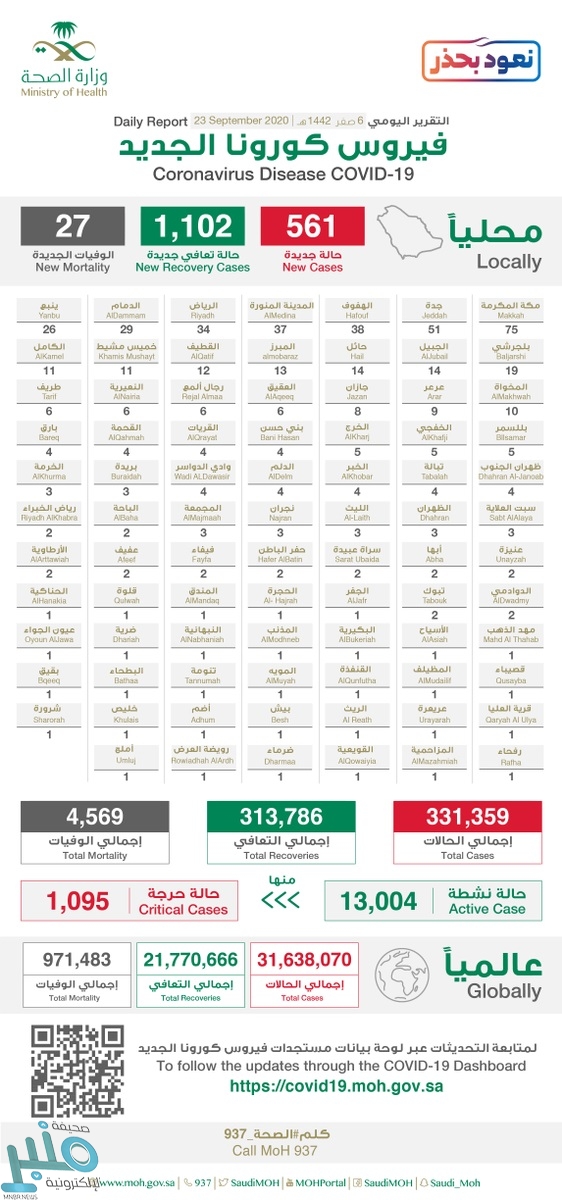 كما تم تسجيل 1102 حالة تعافي جديدة ، ليصل مجموع المتعافين إلى 313786 حالة.