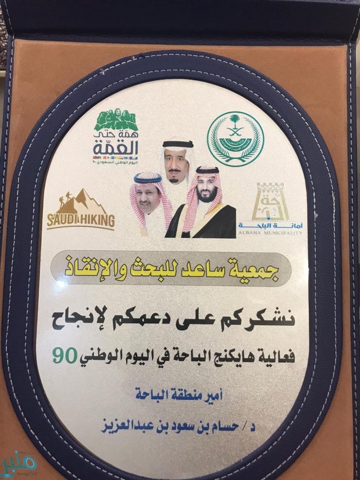 كرم صاحب السمو الملكي الأمير الدكتور حسام بن سعود بن عبدالعزيز أمير منطقة الباحة أعضاء جمعية ساعد للبحث والإنقاذ نظير جهودهم المبذولة والمشاركة الفعالة التي أسهمت في نجاح فعاليات اليوم الوطني السعودي 90 .