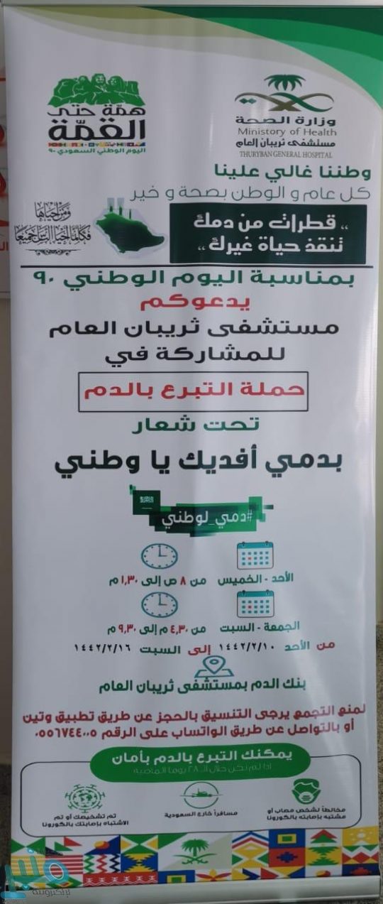 أطلق مستشفى ثريبان العام حملة للتبرع بالدم تحت شعار “بدمي أفديك ياوطني” ، وذلك بمناسبة اليوم الوطني الـ 90 للمملكة.