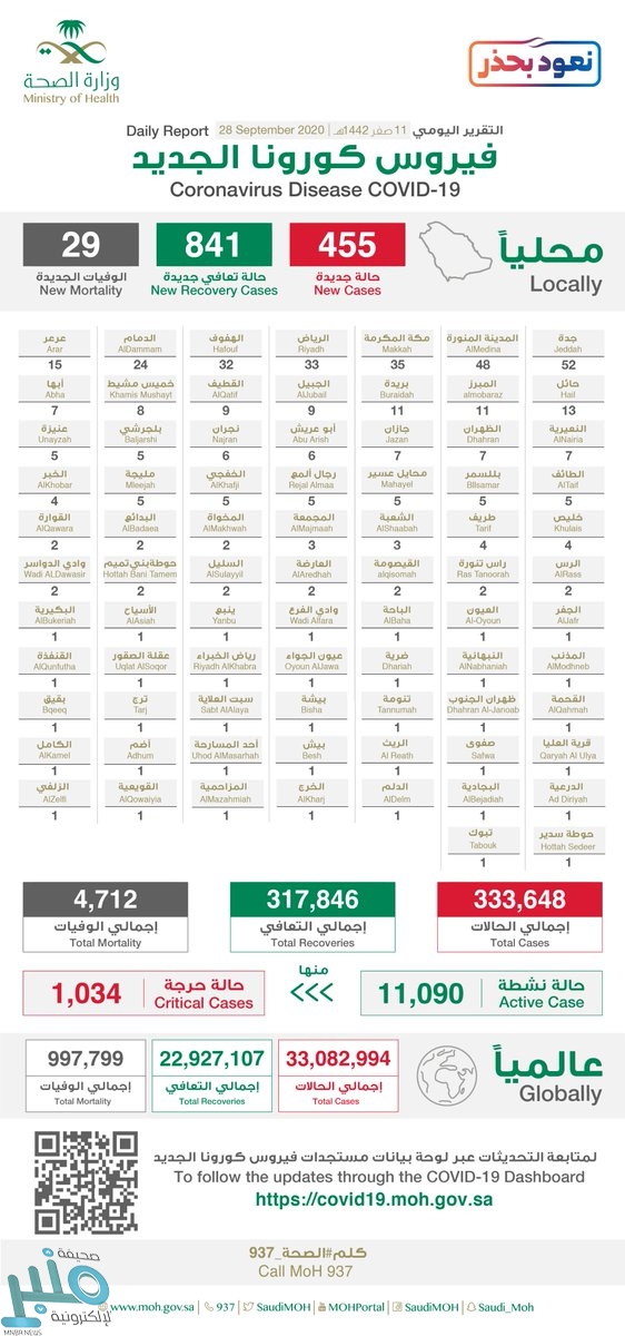 وأضافت الصحة أن إجمالي حالات المصابين في المملكة وصل إلى 333648 حالة حتى الآن .