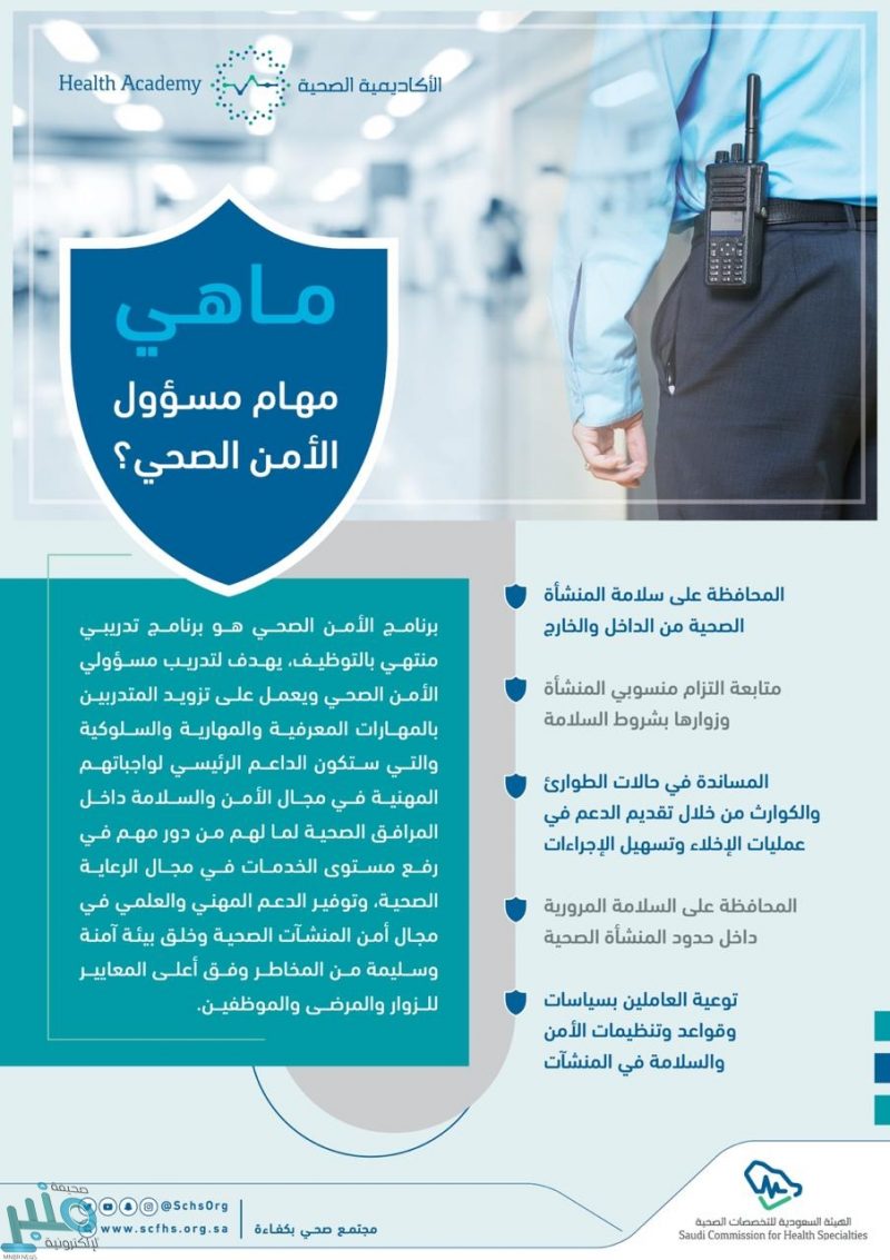 وأوضح مدير إدارة الإعلام والمتحدث الرسمي للهيئة فهد القثامي، أن برنامج الأمن الصحي يعمل على تزويد المتدربين بالمهارات المعرفية والمهارية والسلوكية والتي ستكون الداعم الرئيسي لواجباتهم المهنية في مجال الأمن والسلامة داخل المرافق الصحية.