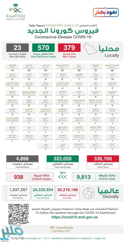 وأضافت الصحة أن إجمالي حالات المصابين في المملكة وصل إلى 336766 حالة حتى الآن ، ووصل مجموع المتعافين إلى 322055 حالة ، فيما بلغ إجمالي الوفيات 4898 حالة وفاة .