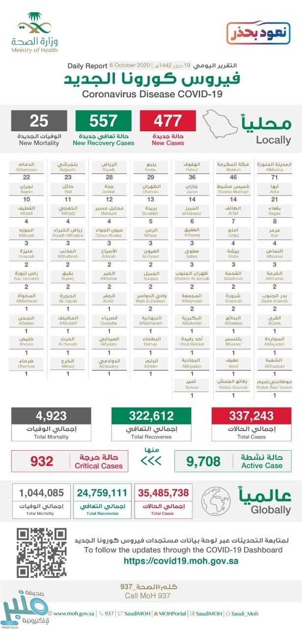 أعلنت وزارة الصحة، اليوم الثلاثاء ، عن تسجيل إصابة 477 جديدة بفيروس “كورونا”، و تسجيل 25 حالة وفاة ، و 557 حالة تعافي .