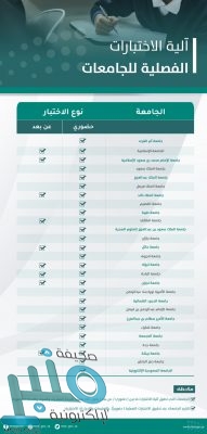 واستعرض إنفوجرافيك نشره حساب وزارة التعليم على موقع تويتر، تفاصيل آلية الاختبارات الفصلية للطلاب والطالبات في الجامعات السعودية، وجاء كما يلي:
