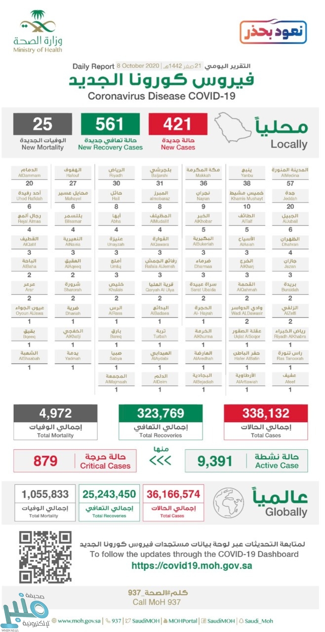 أعلنت وزارة الصحة، اليوم الخميس ، عن تسجيل إصابة 421 جديدة بفيروس “كورونا”، و تسجيل 25 حالة وفاة ، و 561 حالة تعافي .