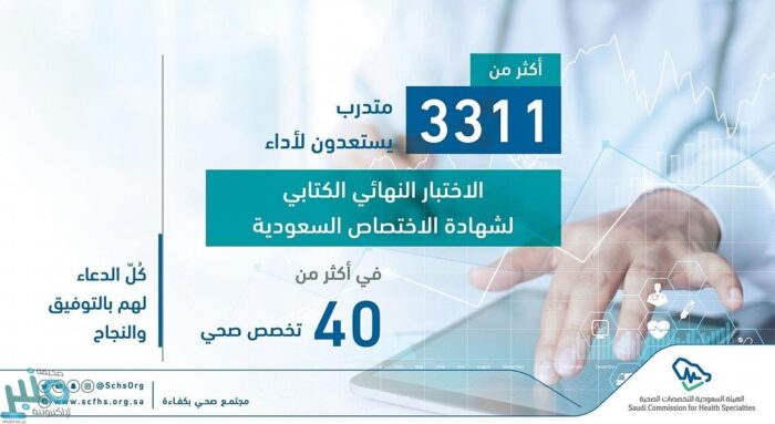 يجري 3311 متدربًا يمثلون أكثر من 40 تخصصاً صحياً اختباراتِهم النهائية هذا الأسبوع في برامج الدراسات العليا لشهادة الاختصاص السعودية، في 6 مراكز اختبارية داخل المملكة وخارجها، وَفْق أعلى الاحترازات الصحية.
