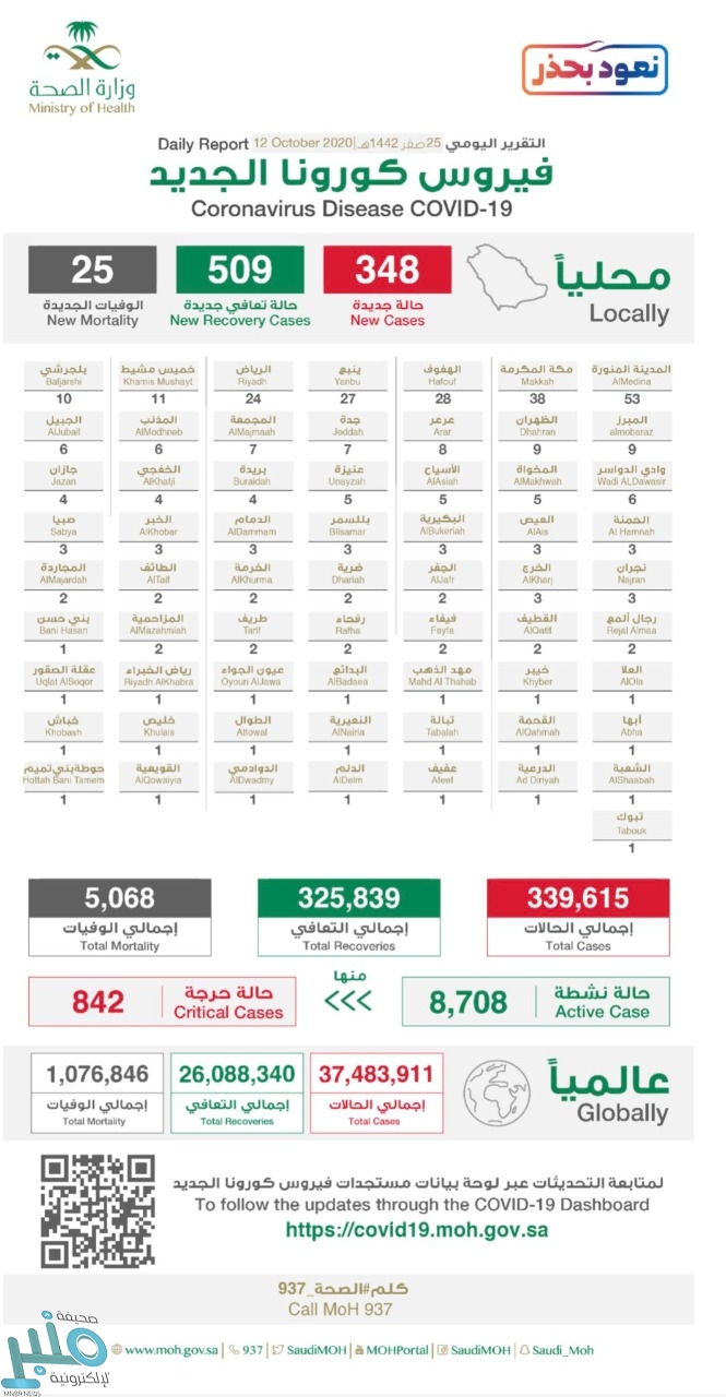 وأضافت الصحة أن إجمالي حالات المصابين في المملكة وصل إلى 339615 حالة حتى الآن ، ووصل مجموع المتعافين إلى 325839 حالة ، فيما بلغ إجمالي الوفيات 5068 حالة وفاة .