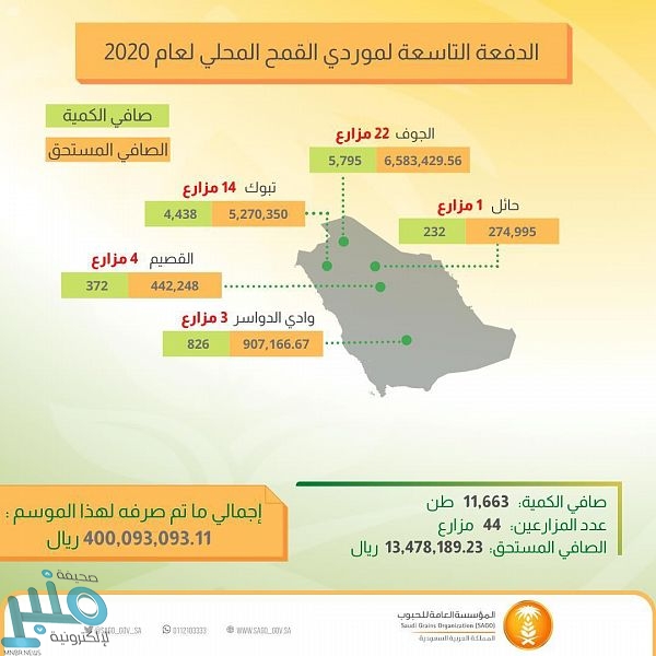 وبلغ إجمالي ماتم إيداعه لهذه الدفعة مبلغ 13,478,189.23 ريالا بحساباتهم البنكية وذلك لـ 44 مزارعا، وبهذا يكون ما تمّ إيداعه مبلغ 400,093,093.11 ريالاً لـ 1,437 مزارعاً بكمية 344,045 طناً، كما سيتم إيداع الدفعات التالية بحسب الكميات الموردة وبعد استكمال إجراءات الاقفال والتدقيق.