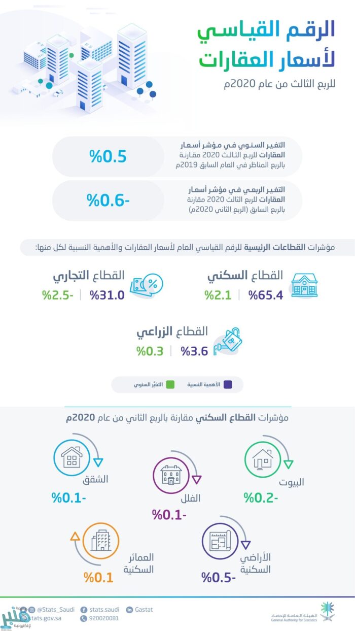 وأشار التقرير إلى انخفاض مؤشر أسعار العقارات بنسبة (-0.6%) في الربع الثالث من عام 2020م مقارنةً بالربع السابق (الربع الثاني من عام 2020م)، ويرجع ذلك بشكل رئيس إلى انخفاض متوسط أسعار العقارات “السكنية” بنسبة (-0.5%)، لا سيما قطع الأراضي السكنية التي انخفضت بنسبة (-0.5%) ، ومن بين العقارات “السكنيَّة” الأخرى، انخفضت أسعار الفلل بنسبة (-0.1%) وأسعار الشقق بنسبة (-0.1%) وأسعار البيوت بنسبة (-0.2%)، في حين ارتفعت أسعار العمائر السكنية بنسبة (+0.1%).