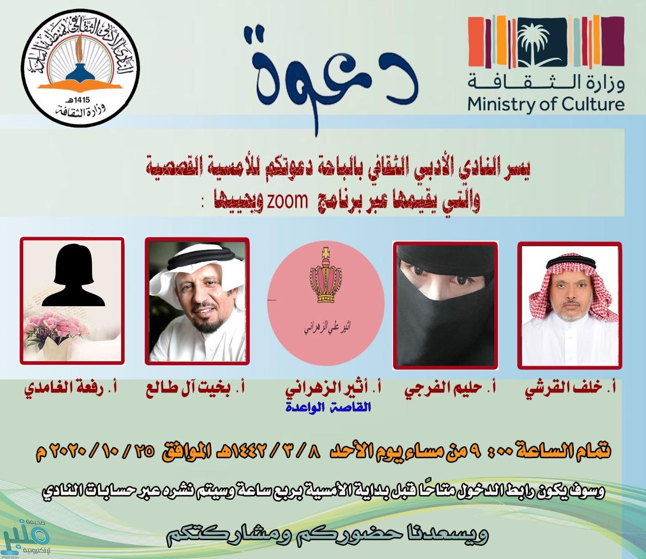 ينظم النادي الأدبي الثقافي بمنطقة الباحة أمسية قصصية الساعة التاسعة من مساء يوم الأحد القادم عبر خدمة zoom
