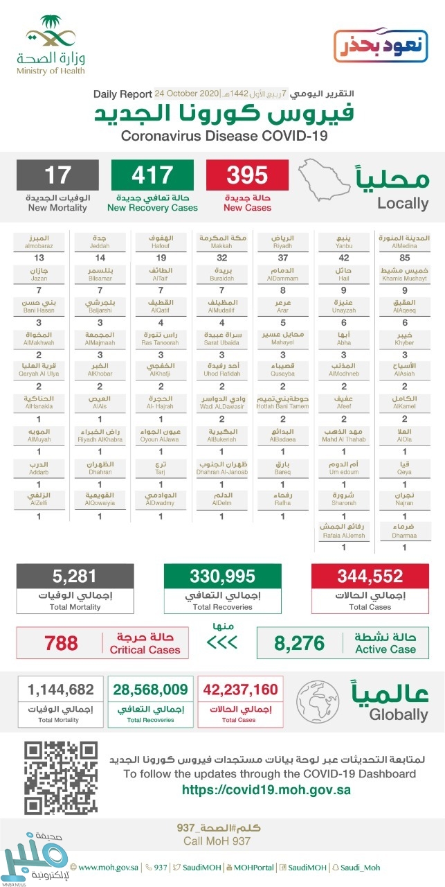 أعلنت وزارة الصحة، اليوم السبت ، عن تسجيل 395 إصابة جديدة بفيروس “كورونا”، و 17 حالة وفاة ، و 417 حالة تعافي .