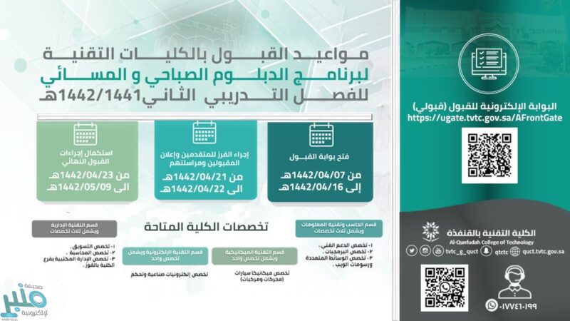 أعلنت الكلية التقنية بالقنفذة عن فتح باب القبول في برنامج الدبلوم للفصل التدريبي الثاني للعام التدريبي ١٤٤١-١٤٤٢هـ اعتباراً من من الـ 07 من شهر ربيع الثاني وحتى الـ 16 من ذات الشهر، وذلك عبر البوابة الالكترونية للقبول “قبولي” : https://ugate.tvtc.gov.sa/AFrontGate/pag