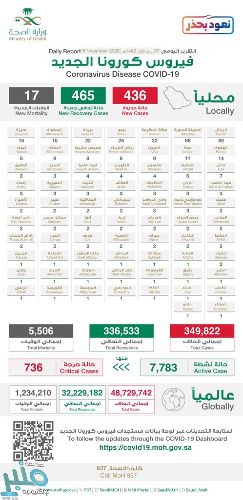 وجاء توزيع حالات الإصابة الجديدة بين مناطق ومدن المملكة كالتالي :