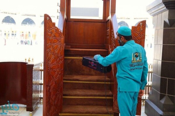 وأفاد الجابري بأنه يتم نقل منبر الخطيب لموقعه بالمكبرية، وتعقيمه وتجهيزه للإمام مع تركيب ميكروفونات الصوت، وإجراء الاختبارات اللازمة لها، كما يتم فرش المكبرية، بسجاد جديد وتنظيفه وتعقيمه وتعطيره ووضع عبوات ماء زمزم المبارك،