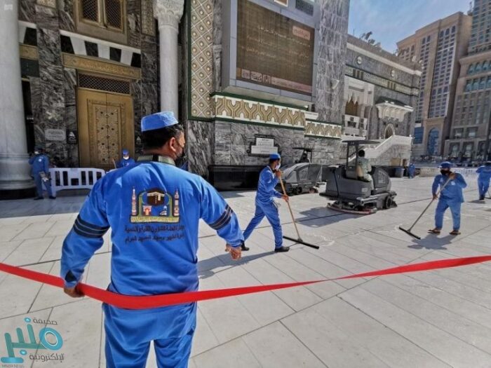 تتولى الرئاسة العامة لشؤون المسجد الحرام والمسجد النبوي تطهير وتعقيم ساحات وصحن المطاف على مدار الساعة في ظل الإجراءات الاحترازية التي تطبق بعناية لمنع وصول فايروس كورونا إلى الحرم الشريف، عبر اكثر (4000) عامل وعامله، يستخدمون يومياً آلاف اللترات من المطهرات والمعقمات.