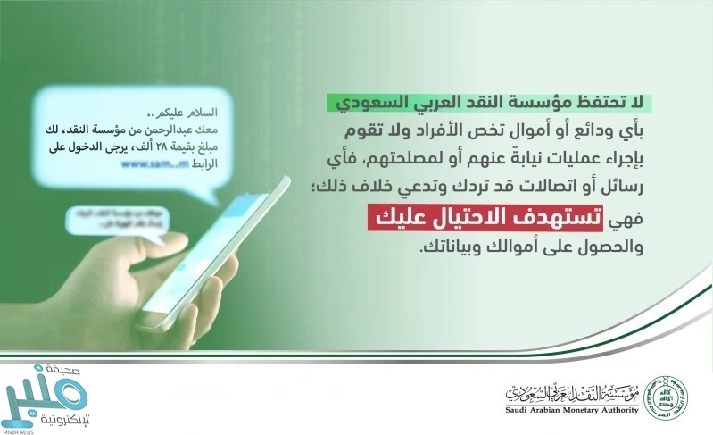 “ساما” تحذر من رسائل الاحتيال: لا نحتفظ بأي ودائع أو أموال تخص الأفراد