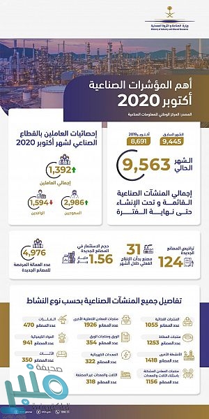 وقال معالي وزير الصناعة والثروة المعدنية الأستاذ بندر بن إبراهيم الخريف عبر حسابه الرسمي في تويتر: “واصل -بحمد الله- القطاع الصناعي اتجاهه الإيجابي لشهر أكتوبر بتوظيف حوالي ثلاثة آلاف سعودي والترخيص لـ124 مصنعًا تخلق خمسة آلاف فرصة عمل مستقبلية، وبدء الإنتاج لـ31 مصنعا رغم ظروف الجائحة، هذه ثمرة للدعم الكبير للقطاع، ودليل تكامل القطاعين الحكومي والخاص وجهود زملائي في المنظومة”.