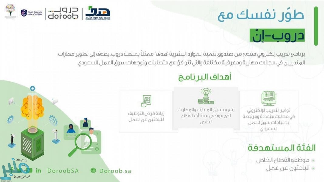 أطلق صندوق تنمية الموارد البشرية (هدف)، ممثلاً في المنصة الوطنية للتدريب الإلكتروني “دروب” اليوم, برنامج “دروب ــــ إنْ”، الهادف إلى تطوير مهارات المتدربين من موظفي القطاع الخاص والباحثين عن عمل في مجالات مهارية ومعرفية مختلفة، تتوافق مع متطلبات وتوجهات سوق العمل السعودي، من خلال منحهم تدريب غير محدود لأكثر من 16,000 دورة تدريبية في منصة عالمية للتدريب الإلكتروني لمدة 6 أشهر.
