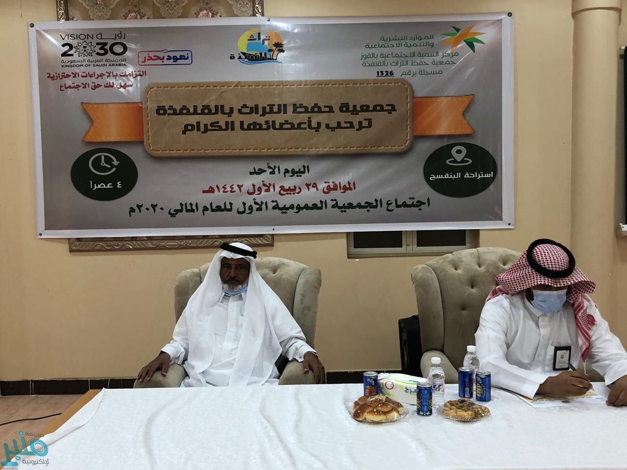 عقدت جمعية التراث في محافظة القنفذة اجتماع الجمعية العمومية العادية لهذا العام ١٤٤٢هـ، بحضور رئيس الجمعية إبراهيم بن علي الفقيه، وأعضاء مجلس إدارة الجمعية، والمؤسسين، وعدد من أعضاء الجمعية العمومية، ورؤساء اللجان، وكذلك حضور مندوب مركز التنمية الاجتماعية في القنفذة – القوز الحسين رباع المعيدي، والمدير التنفيذي للجمعية وليد الرحماني.