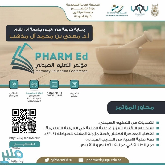 يسعى مؤتمر التعليم الصيدلي الأول، الذي تنظمه كلية الصيدلة بجامعة أم القرى عن بعد بتاريخ ٢٨-١١/٢٩/ ٢٠٢٠ م الموافق ١٣-١٤ /٤/ ١٤٤٢ هـ ، لإقامة مجموعة متميزة من الفعاليات المتنوعة تشمل (المحاضرات العلمية، وحلقات النقاش، وورش العمل)، و تهدف إلى تسليط الضوء على أبرز المستجدات والتطورات في مجال التعليم الصيدلي، ومناقشة القضايا التعليمية والتحديات المستجدة في التعليم الصيدلي، والدراسات والأبحاث ذات العلاقة بتطبيقات استخدام التقنية لتعزيز فاعلية الطلبة في العملية التعليمية.