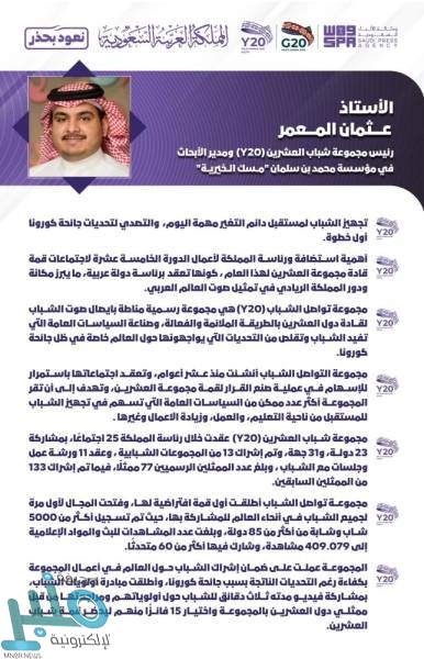 أكد رئيس مجموعة شباب العشرين (Y20) ومدير الأبحاث في مؤسـسة محمد بن سلمان “مــسك الــخيريــة” عــــثمان المــــعمر أهمية استضافة ورئاسة المملكة لأعمال الدورة الخامسة عشرة لاجتماعات قمة قادة مجموعة العشرين لهذا العام ، كونها تعقد برئاسة دولة عربية، ما يبرز مكانة ودور المملكة الريادي في تمثيل صوت العالم العربي، ولكونها دولة أكثر سكانها من الشباب، ولهذا وضعت المملكة العربية السعودية من أحد أهدافها تمكين المرأة والشباب.