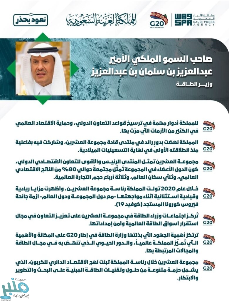 وقال سمو وزير الطاقة : “خلال عام 2020، تولت المملكة رئاسة مجموعة العشرين، وأظهرت مزايا ريادية وقيادية استثنائية أثناء مواجهتها، مع دول المجموعة، ودول العالم، الأزمة غير المسبوقة التي تمثلت في جائحة فيروس كورونا المستجد (كوفيد 19)، وما ترتب عليها من أزمات اقتصاديةٍ واجتماعية وصحية، لا يزال العالم يُعاني منها إلى اليوم”، منوهاً سموه بالنجاح المتميز الذي حققته المملكة في مواجهة الجائحة داخلياً، وبالدور الذي نهضت به في مواجهة الجائحة وتبعاتها عالمياً، حيث طرحت مبادرات جوهرية، منطلقة من شعار “لنلهم العالم برؤيتنا”.