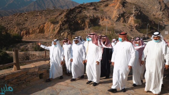 وكان في استقبال الوفد لدى وصوله رئيس مجلس إدارة غرفة المخواة ماشي بن محمد العمري، وبدأ البرنامج بزيارة قرية “ذي عين” الأثرية الشامخة بمبانيها التراثية المتناسقة بشكل هرمي والتي تتوسد جبال بيضاء ساحرة أضحت معها كأنها منارة تاريخية ثريّة، ومنها انطلق الوفد إلى قمة جبل شدا، حيث استراحة الكهوف ذات التشكيل الجيولوجي الفريد والتجويفات الجرانيتية العميقة، التي اتخذها الإنسان سكنًا ومأوى منذ الآف السنين.