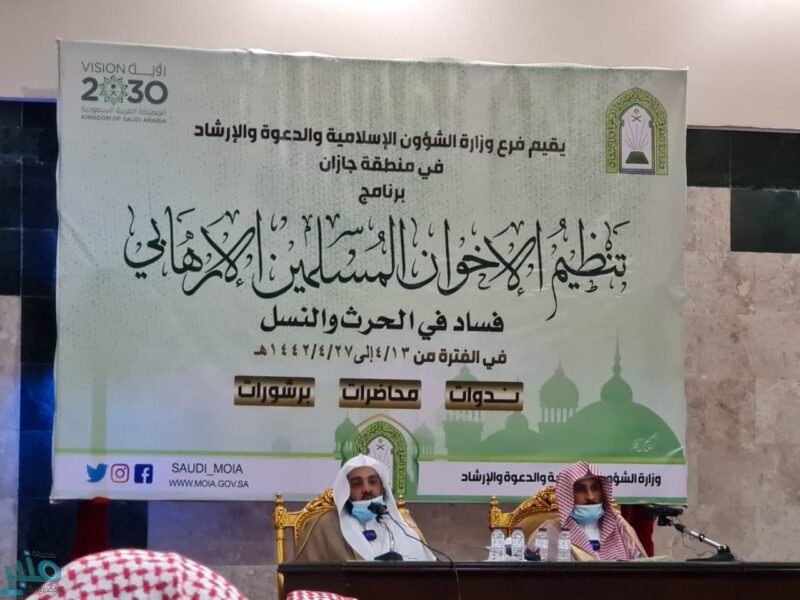 مما يذكر أن فعاليات البرنامج الدعوي ” تنظيم الإخوان المسلمين الإرهابي فساد في الحرث والنسل” تتواصل بأكثر من 250 فعالية ما بين محاضرة وندوة وملتقى؛ لفضح التنظيم وبيان خطره على أمن الأوطان، ينفذها دعاة الوزارة بمساجد وجوامع منطقة جازان على مدى شهرين متصلين وعبر الوسائط الإلكترونية.