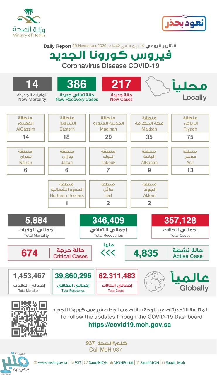 وأضافت الصحة أن إجمالي حالات المصابين في المملكة وصل إلى 357128 حالة حتى الآن ، ووصل مجموع المتعافين إلى 346409 حالة ، فيما بلغ إجمالي الوفيات 5884 حالة وفاة .