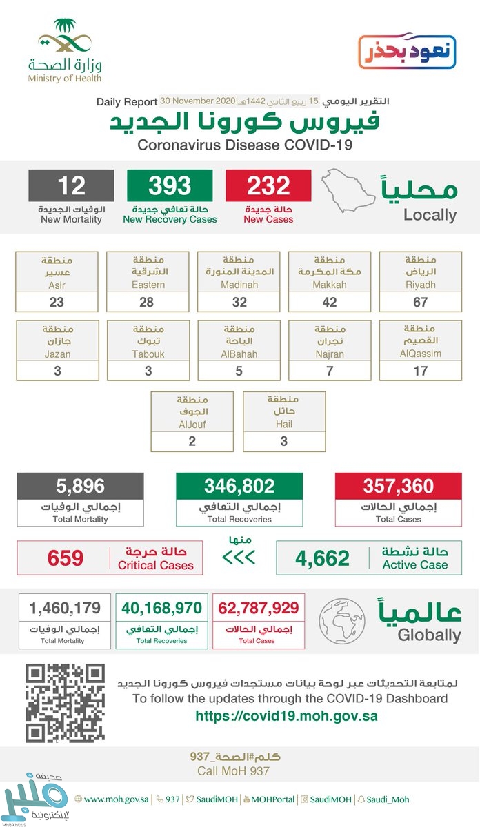 وجاء توزيع حالات الإصابة الجديدة بين مناطق المملكة كالتالي :