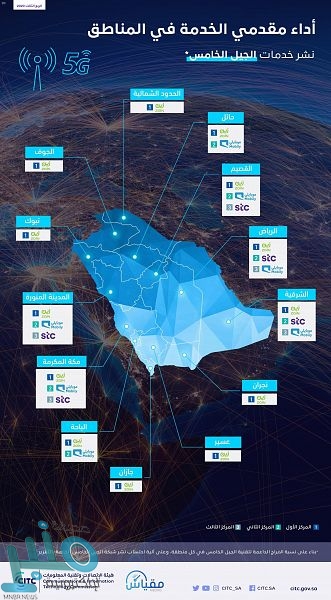 وكشفت الهيئة في تقريرها الربعي “مقياس” لمؤشرات سرعة الإنترنت وسرعة الوصول للمحتوى الرقمي في المملكة عن تصدر شركة زين لقائمة انتشار خدمات الجيل الخامس في المملكة؛ حيث قامت بنشر خدمات الجيل الخامس في 41 محافظة، جاءت بعدها شركة موبايلي بـ 16 محافظة، وأخيرا شركة الاتصالات السعودية STC بعد قيامها بنشر خدمة الجيل الخامس في 7 محافظات.